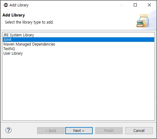 그 다음에는 Add Library 클릭하여 Junit 라이브러리를 추가해준다. (Junit 버전은 환경마다 다를 수 있음)