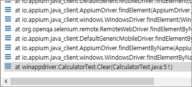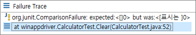 즉 이 함수는 "표시는 0" 결과값을 표시는은 잘라내어서 "0"만 출력해주는 함수로 Assert.assertEquals("0", _GetCalculatorResultText()); 이 코드의 Assert 기대 값과 일치하게 된다. 다시 실행해보면 에러가 해결되고 다음 에러가 또 발생한다.