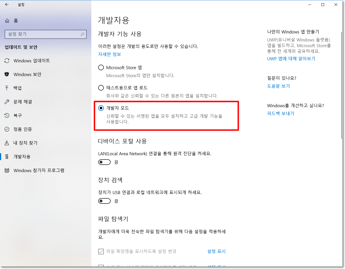 윈도우 10 설정 > 업데이트 및 보안 > 개발자용 메뉴에서 개발자 모드를 켜준다.