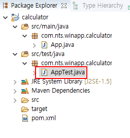 별다른 설정은 건드리지 않고 생성하였다. 위에 있는 코드 중 패키지 코드를 제외한 코드를 복사해서 AppTest.java에 붙여넣기 한다.