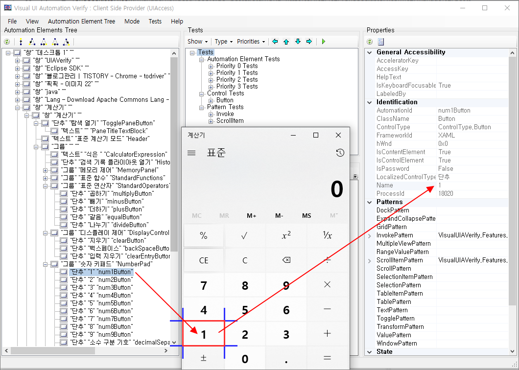 이게 영문 윈도우 계산기에서는 요소가 "Clear"로 표시되는건데 한글 윈도우에서는 다르게 나온다. 이를 확인하기 위해 C:\Program Files (x86)\Windows Kits\10\bin\10.0.17134.0\x86\UIAVerify 이 경로에서 VisualUIAVerifyNative.exe 를 실행해준다.