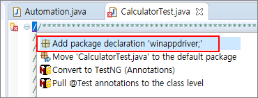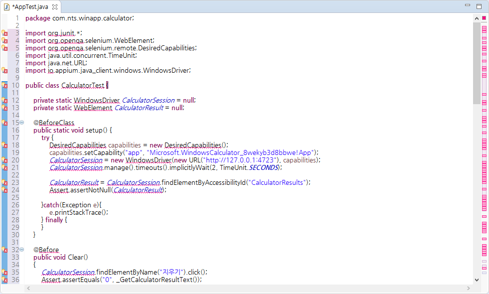 전에 다운로드 받았던 Calculator 샘플코드를 복사해온다. 경로 WinAppDriver-master\Samples\Java\CalculatorTest\src\test\java\CalculatorTest.java