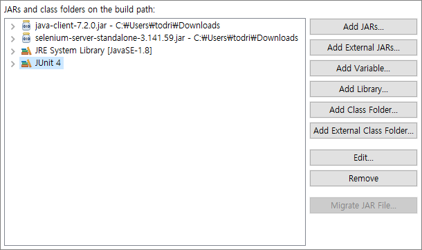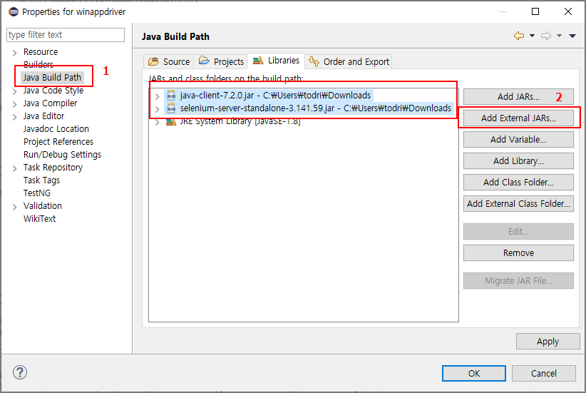 프로젝트 우클릭 > Properties > Java Build Path > Add External JARS.. 클릭하여 아까 받은 appium과 Selenium 라이브러리를 추가해준다.