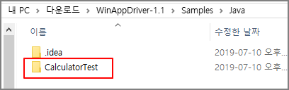 압축을 풀고 나면 WinAppDriver-1.1\Samples\Java 이 경로에 CalculatorTest 예제 프로젝트를 확인할 수 있다.