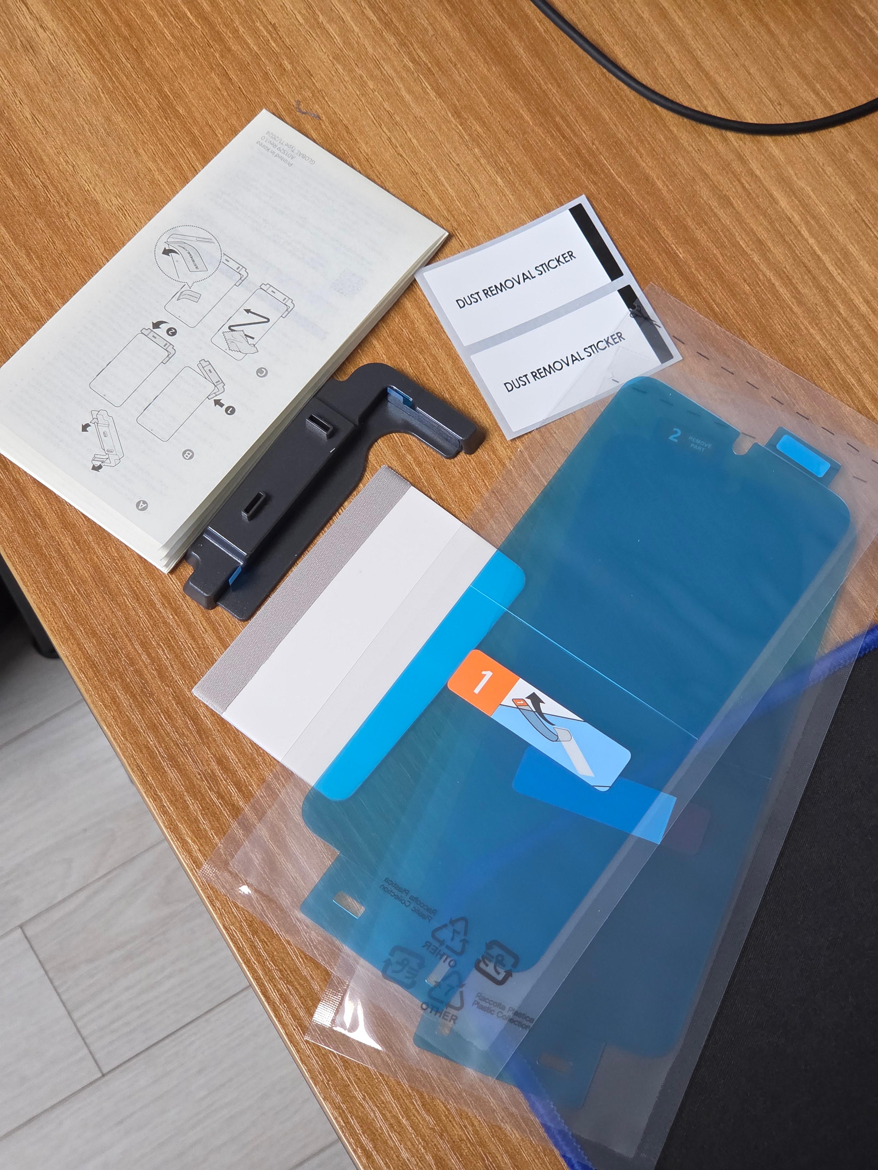 뭔가 빛을 산란 시키는 느낌이었다. 막상 폰 사용해보면 부착 전과 후 큰 차이는 느끼지 못했는데 그냥 액정 보호도 겸사겸사 한다는 생각으로 쓰면 될 것 같다. 부착은 혼자서 충분히 할 수 있도록 큐알 코드로 동영상 가이드도 제공 되었고 고정툴에 밀대, 헝겊 등 아주 잘되어있어서 큰 무리가 없었다. 먼지만 잘 떼주면 될 듯